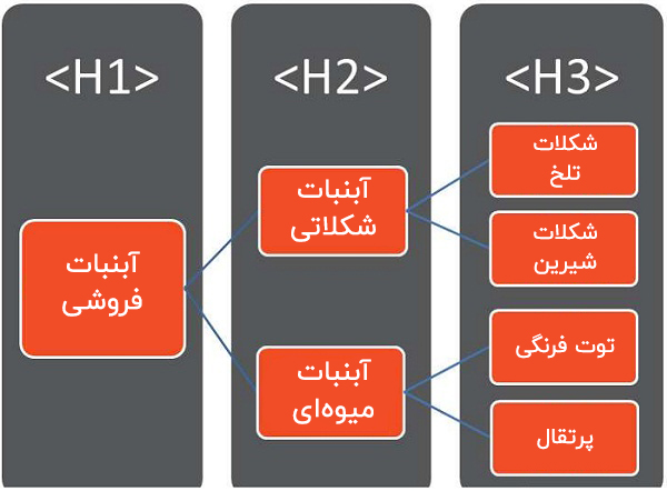 بهنگام تولید محتوا برای سایت همیشه تلاش کنید که ساختار را در نوشتههایتان رعایت کنید. برای رعایت ساختار عنوان آن را با سرنویس1 (H1)، تیترهای اصلی را با سرنویس2 (H2) و زیر شاخه هایش را با H3، H4 و… معلوم کنید. این کار هم گوگل را برای خواندن مطلبتان بهتر راهنمایی میکند و هم کاربران را. به تصویر زیر نگاه کنید، همانطور که میبینید عنوان یا موضوع اصلی صفحه که در اینجا آب نبات فروشی است با تگ <H1>، زیر شاخههای آب نباتفروشی که به دو دسته ی آب نبات شکلاتی و میوهای تقسیم شدهاند در تگ <H2> و زیر شاخههای آنها نیز در تگ <H3> قرار گرفتهاند. شما هم با توجه به موضوع و بخشبندیهای متنتان باید ساختاری متناسب را ایجاد کنید و عنوانهای هر بخش را با تگهای <H> جدا کنید.
