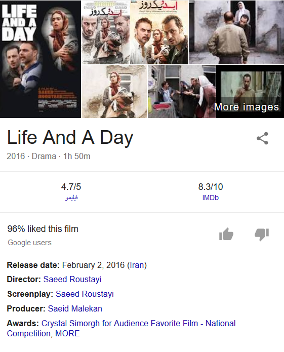در عکس میبینید که درباره ی فیلم “ابد و یک روز” جست و جو شده است. همچنین یک نظرسنجی از سایت “فیلمیو” گرفته و آنرا به ما نمایش داده است. پس میفهمیم گوگل هم به سایت های ایرانی توجه لازم را دارد.